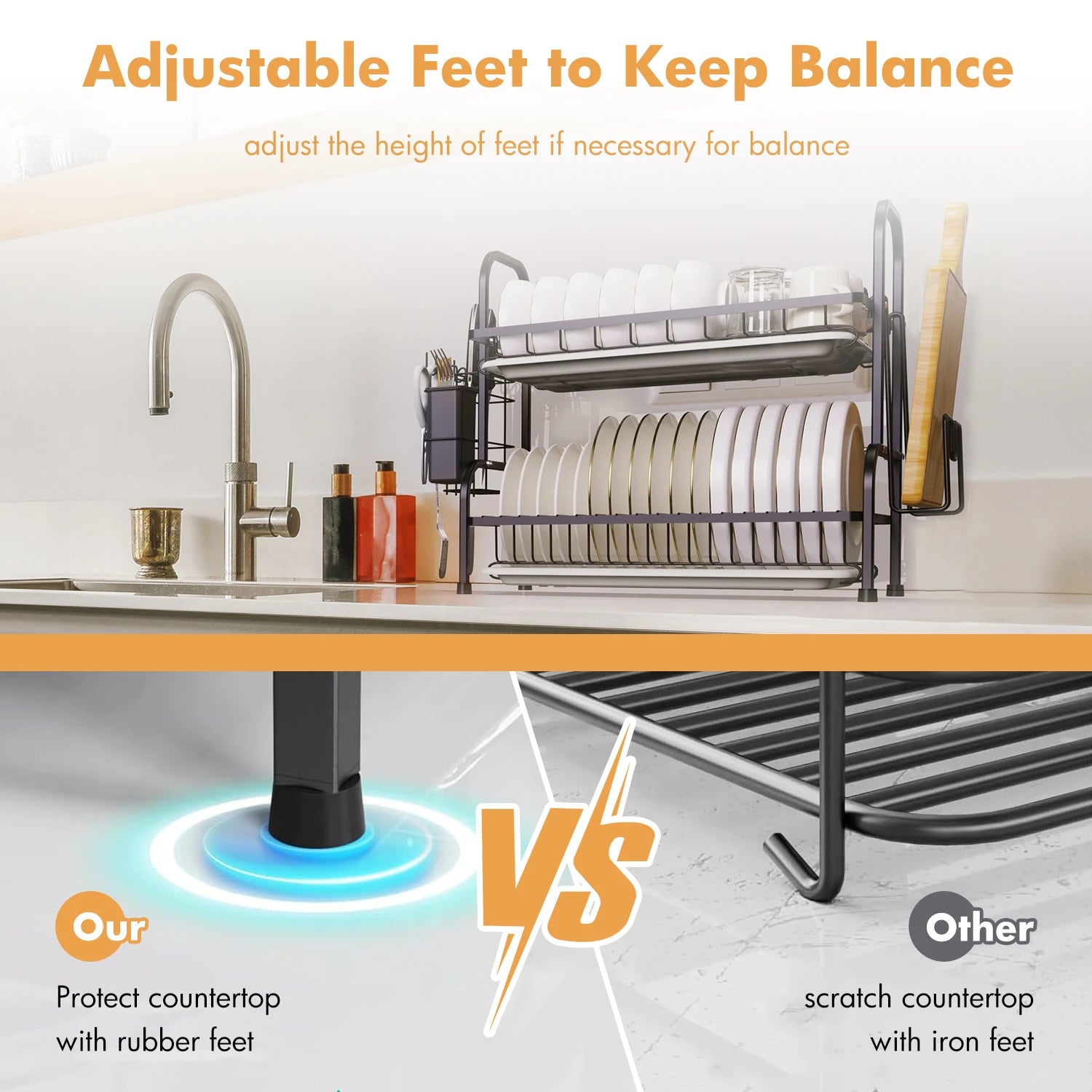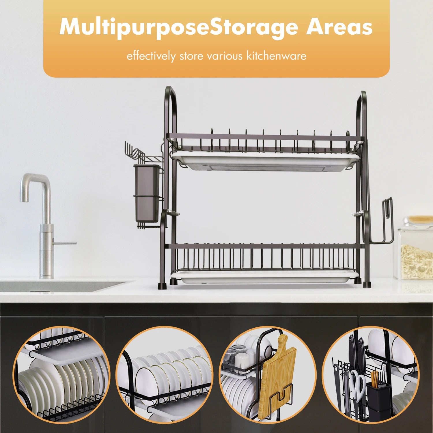 2-TierDish Drying Rack for Kitchen Drain Board Tray Compact Dishing Rack Space-Saving with Utensil Holder Drainboard