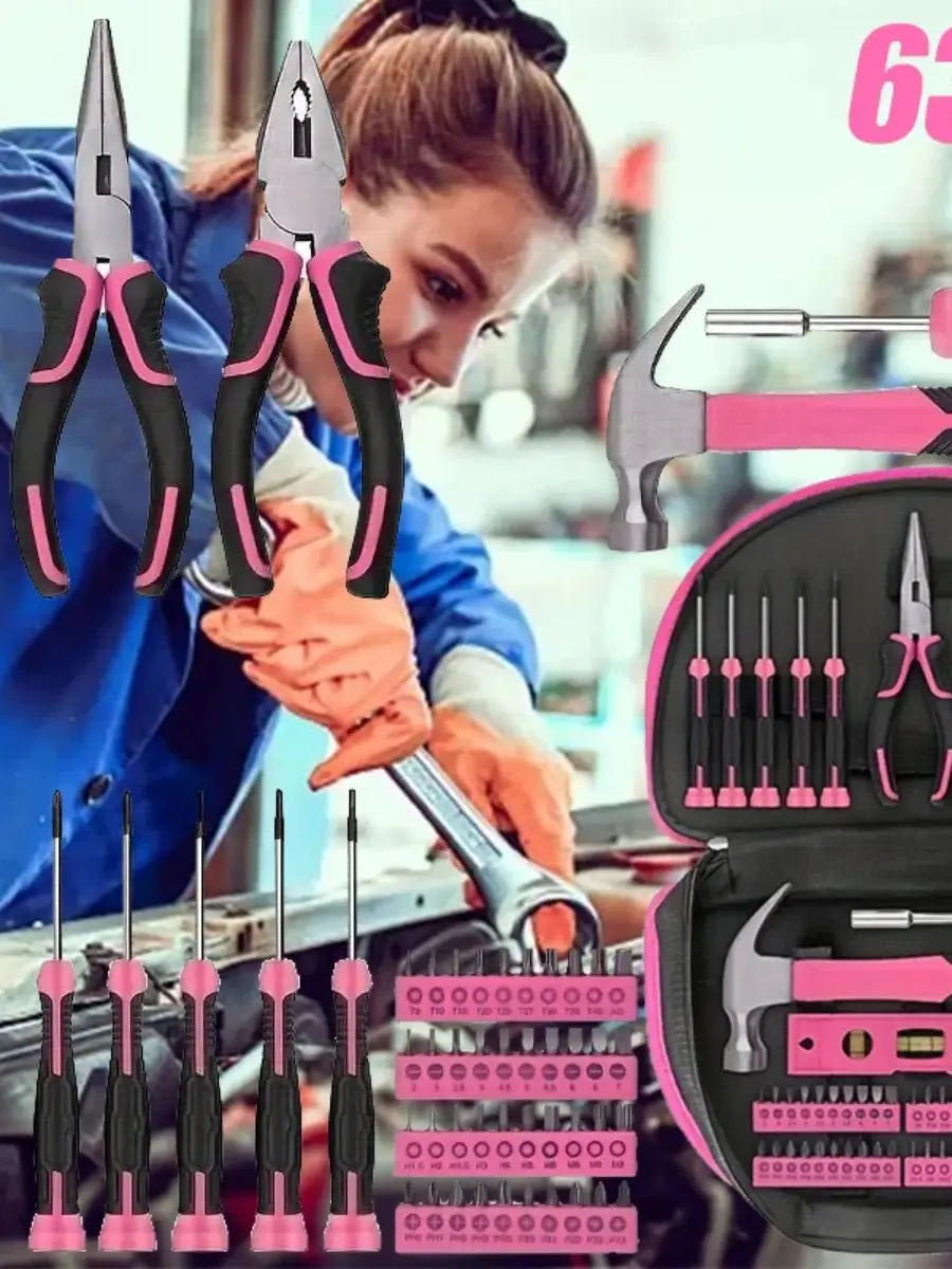 63pcs Pink Home Repair Tool Set for Women with Durable Metal Hand Tools, DIY Household