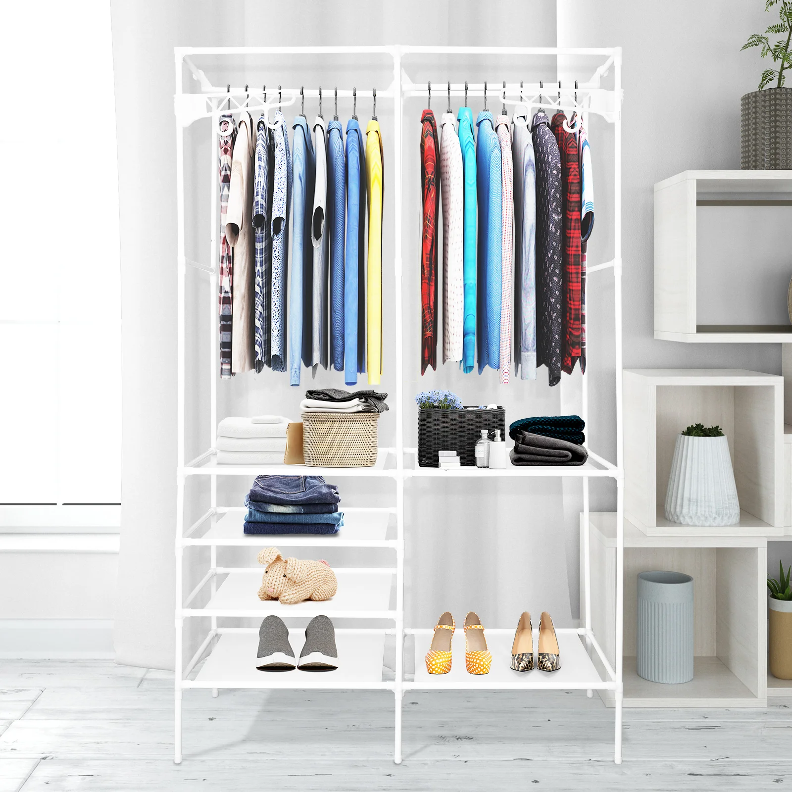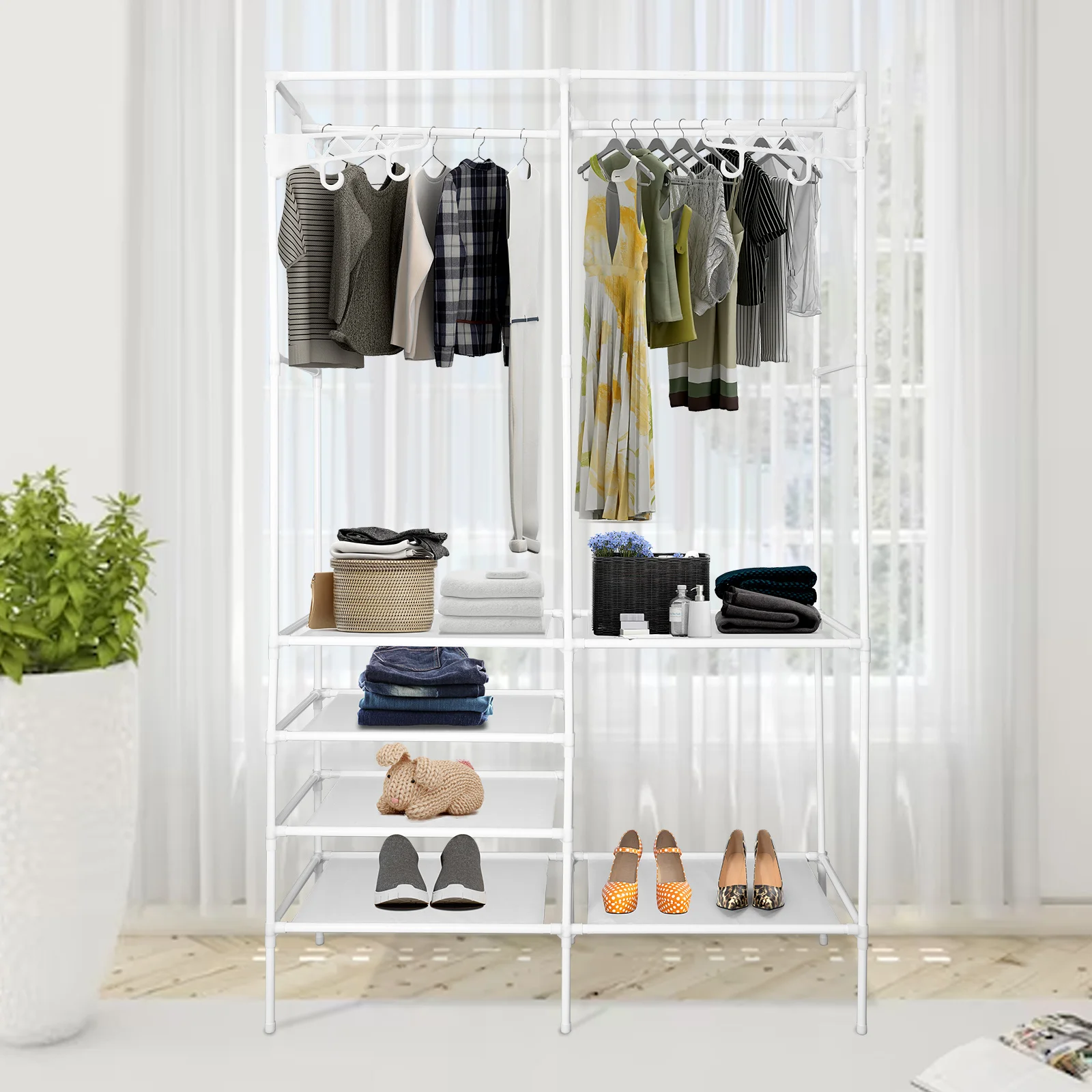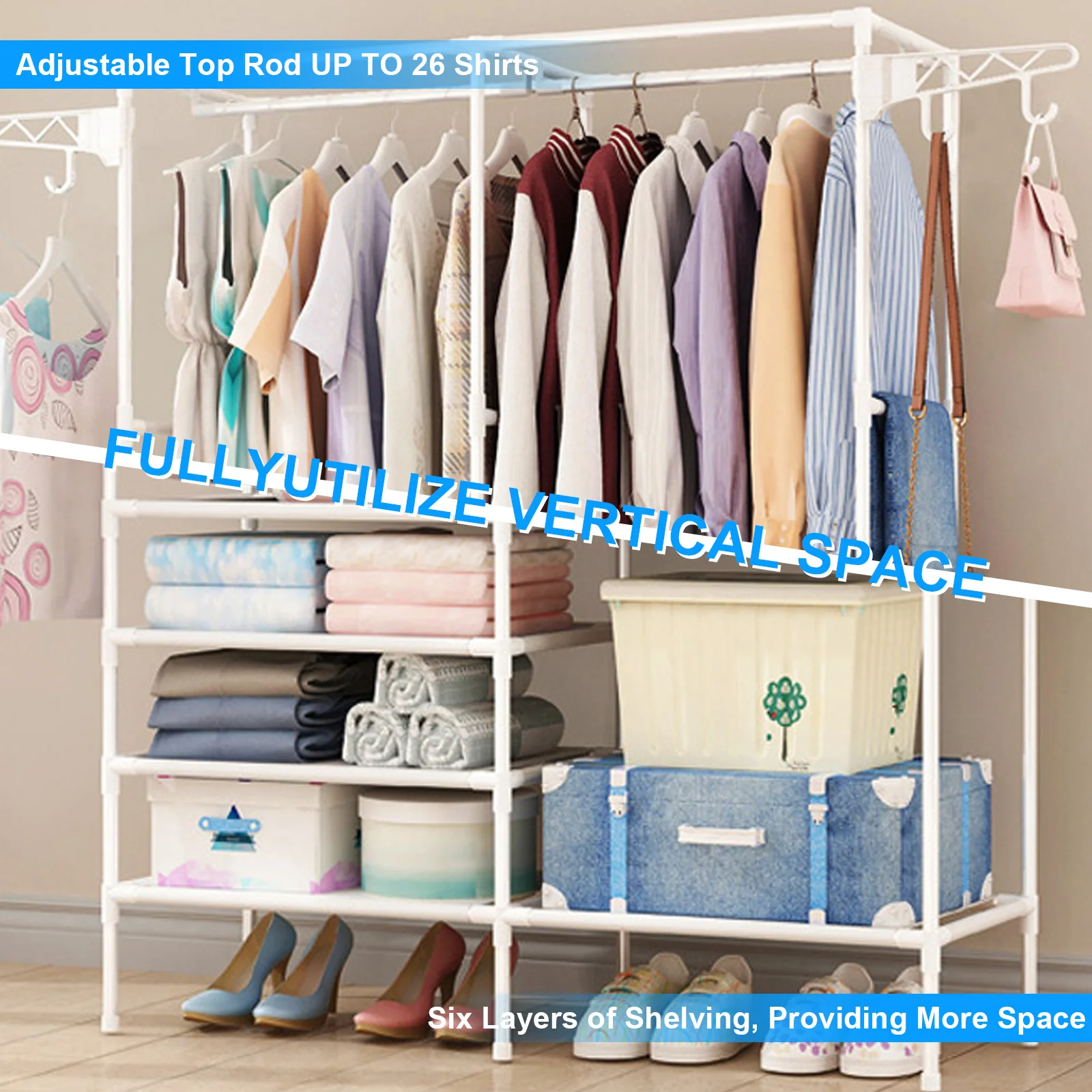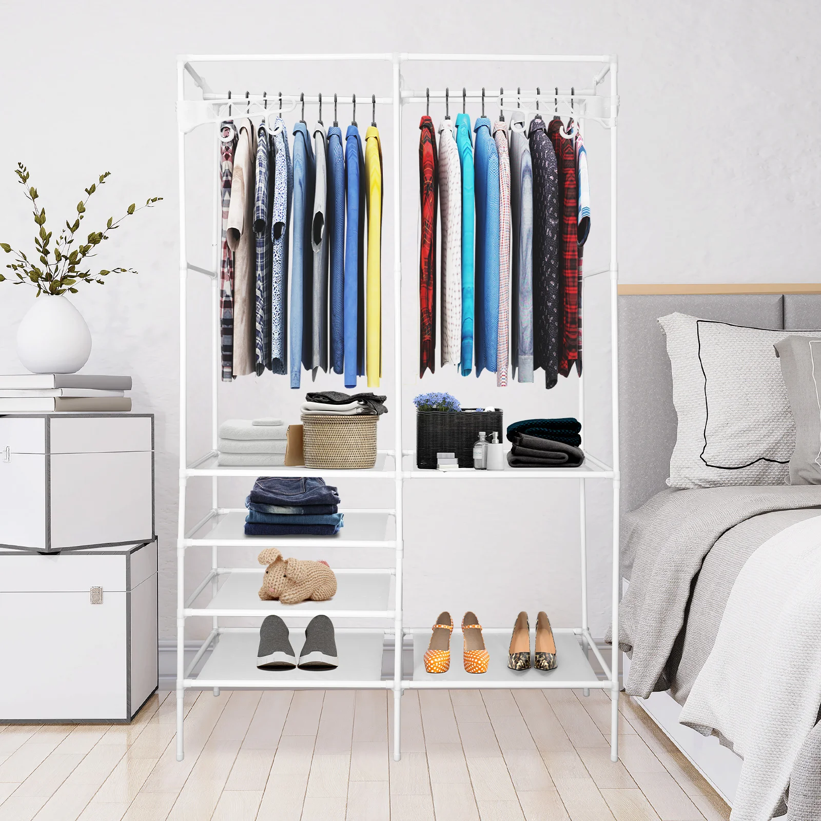 [PLENTY STORAGE SPACE] - Extra large clothes closet rack with 2 clothes rails, it can hang coats, long dresses, jackets, and other heavy clothes. The underlying is equipped with 4 layers of shelving to add extra space to store bedding, shoes, and boxes.
