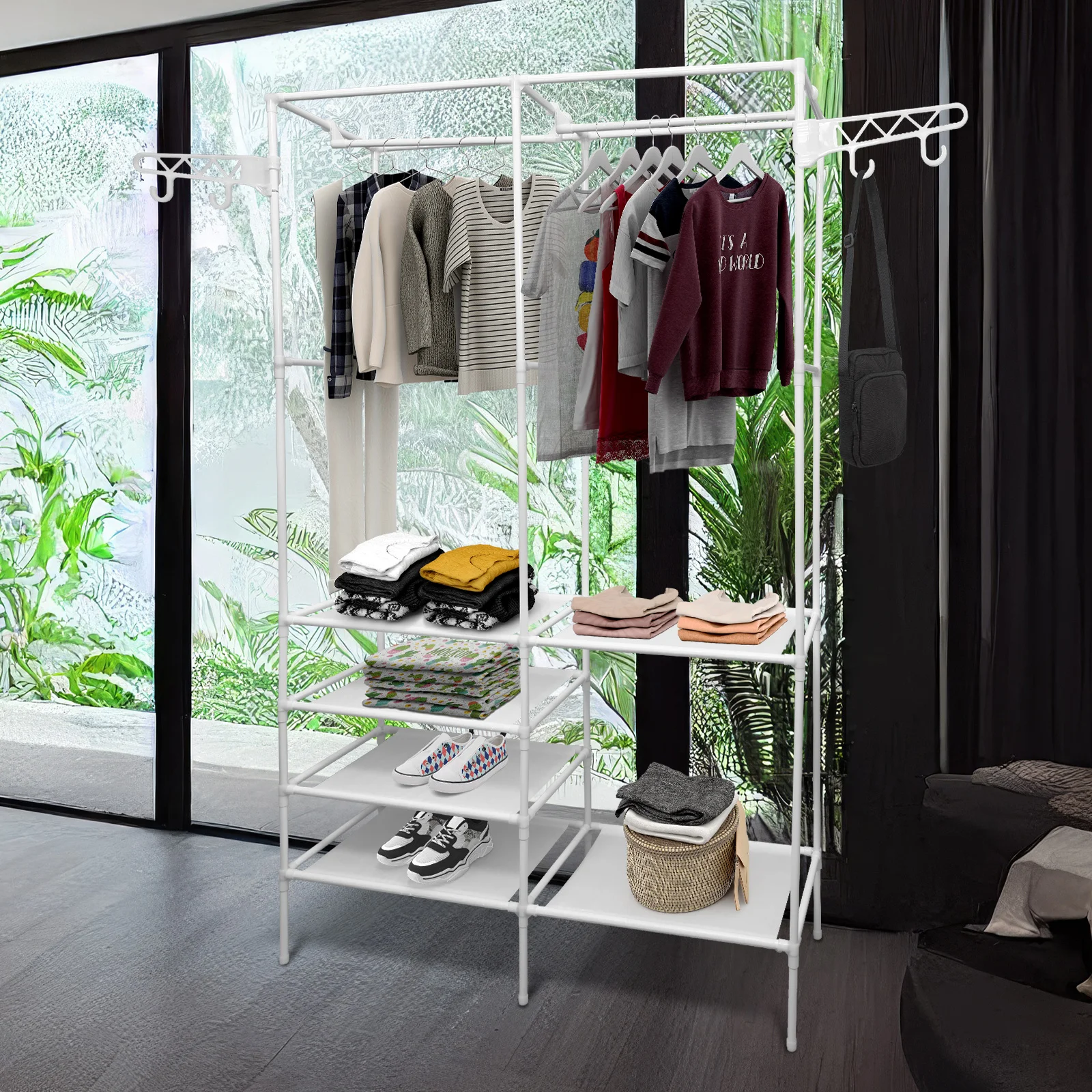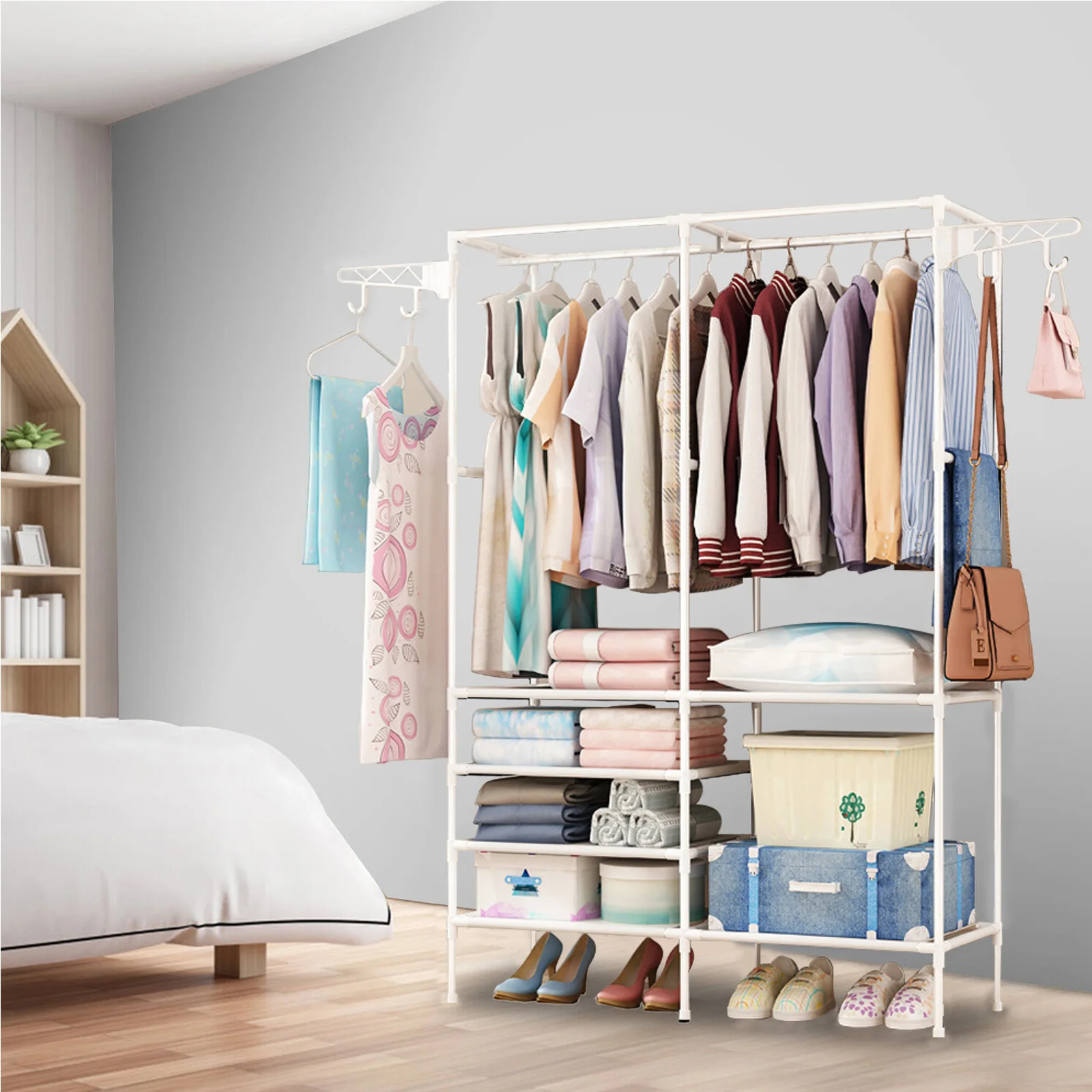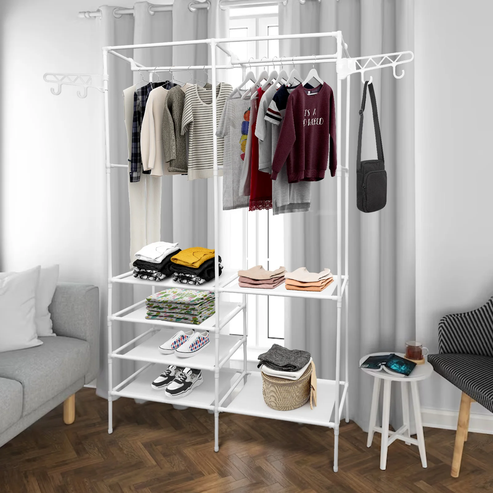 [PLENTY STORAGE SPACE] - Extra large clothes closet rack with 2 clothes rails, it can hang coats, long dresses, jackets, and other heavy clothes. The underlying is equipped with 4 layers of shelving to add extra space to store bedding, shoes, and boxes.