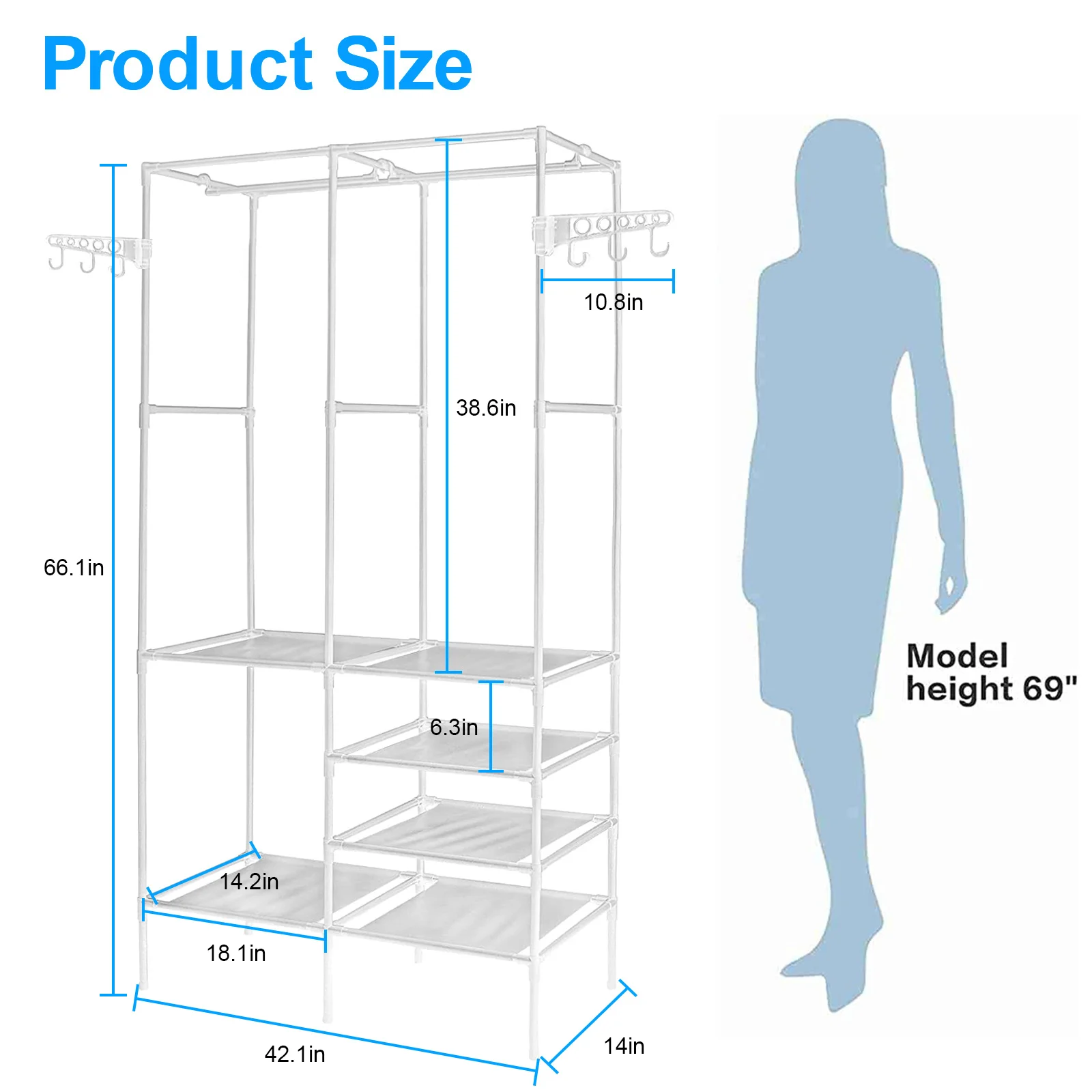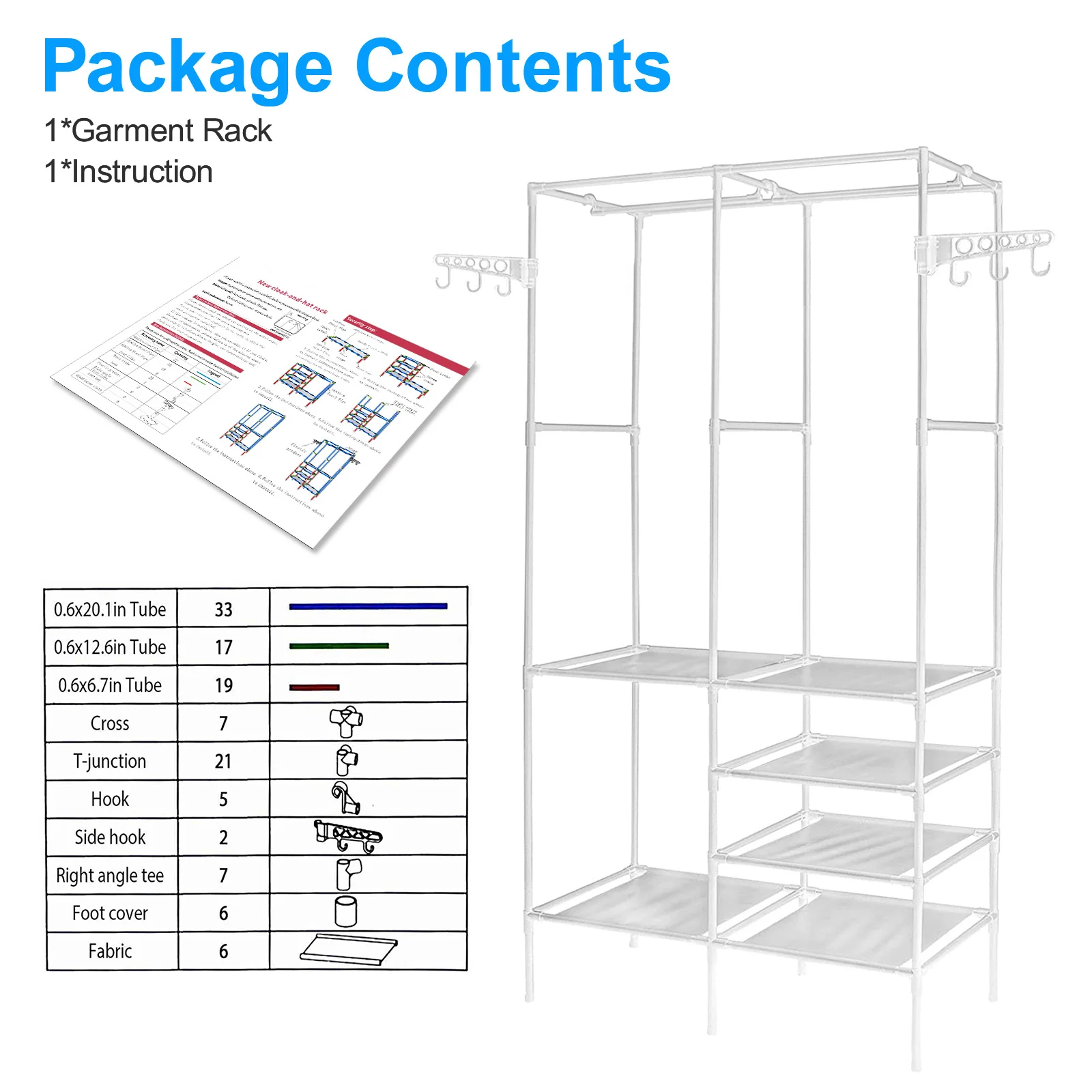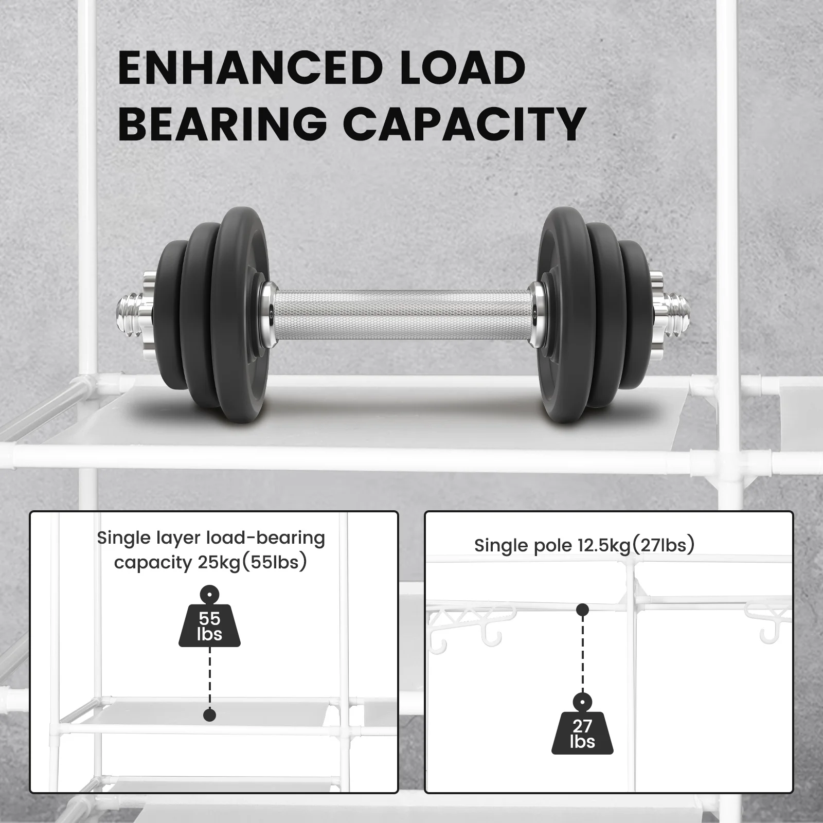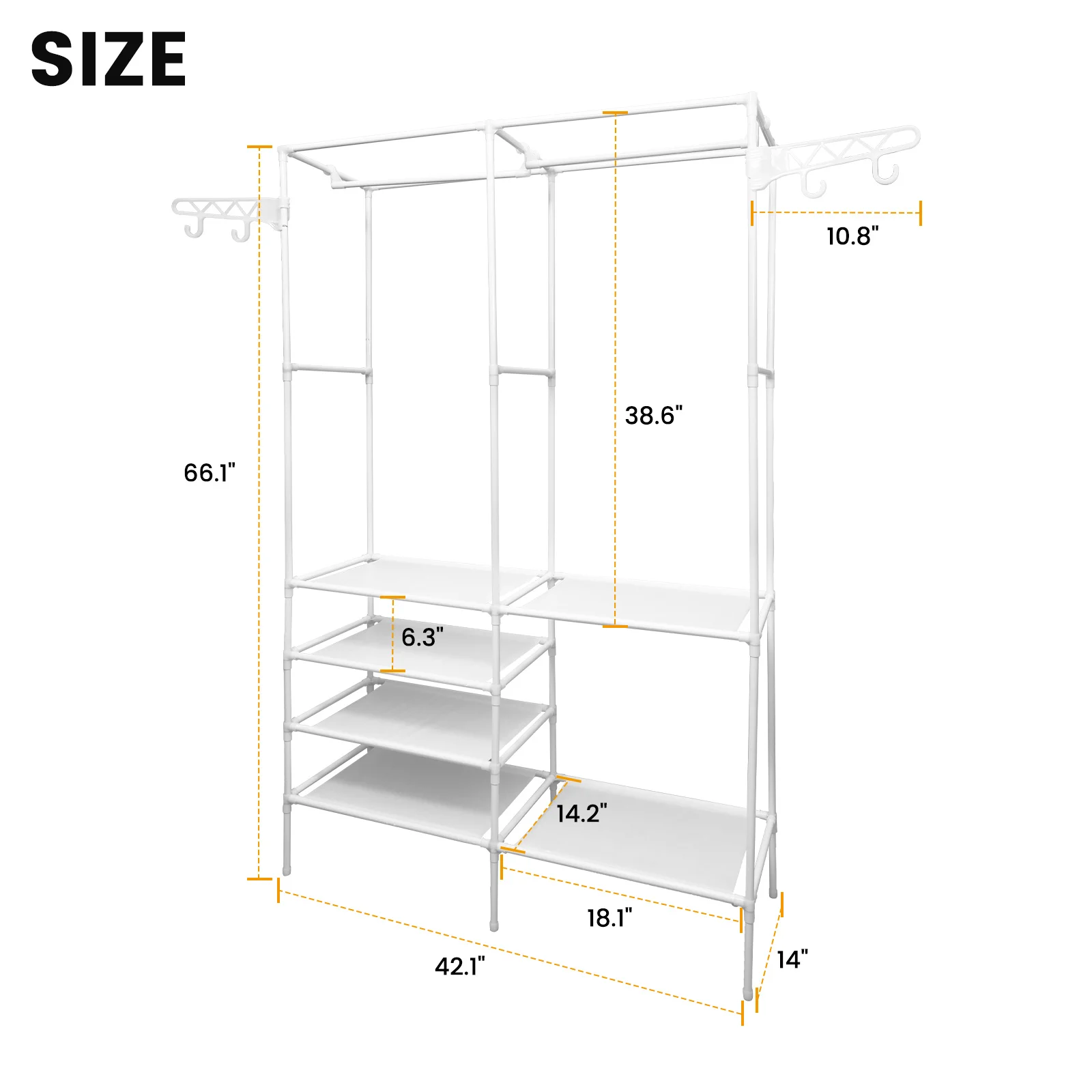 [PLENTY STORAGE SPACE] - Extra large clothes closet rack with 2 clothes rails, it can hang coats, long dresses, jackets, and other heavy clothes. The underlying is equipped with 4 layers of shelving to add extra space to store bedding, shoes, and boxes.