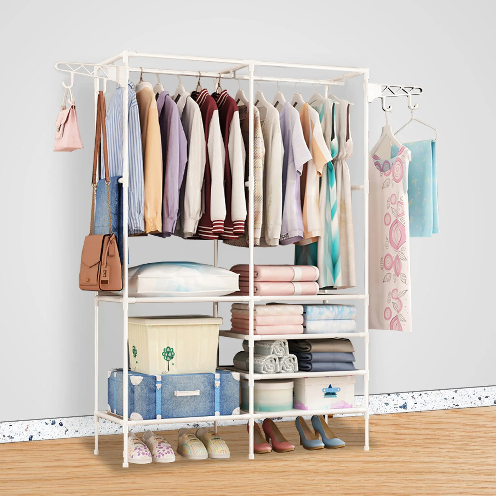 Metal Garment Clothing Rack Shoe Clothing Organizer Shelves Freestanding Multifunctional Clothes Wardrobe