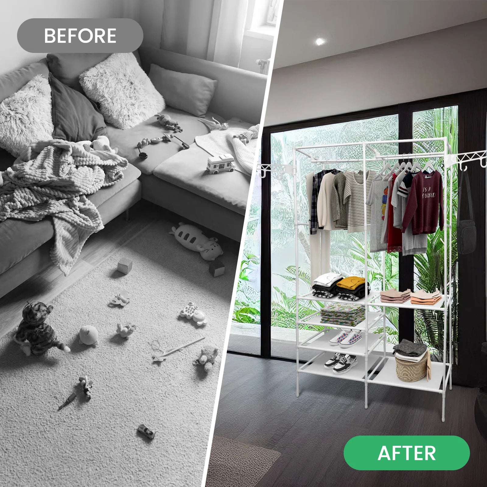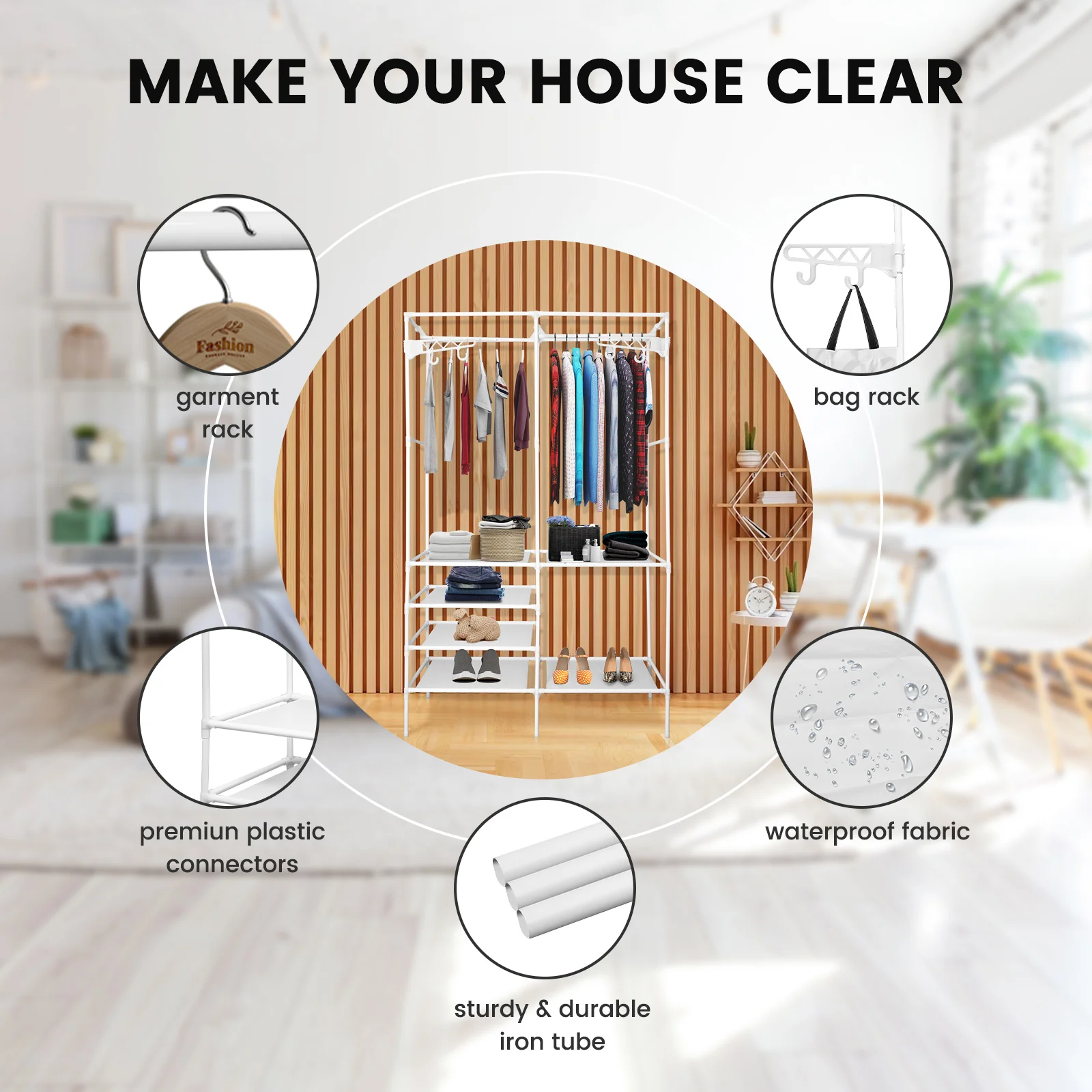 [PORTABLE WARDROBE RACK] - This garment rack is great for creating storage space to organize your clothes and shoes in your laundry room and bedroom. Simple and chic design adds instant storage to your room. This portable coat rack is made of highly-quality iron pipe, which is strong in bearing capacity, stable and durable. It can be easily located anywhere in your house.